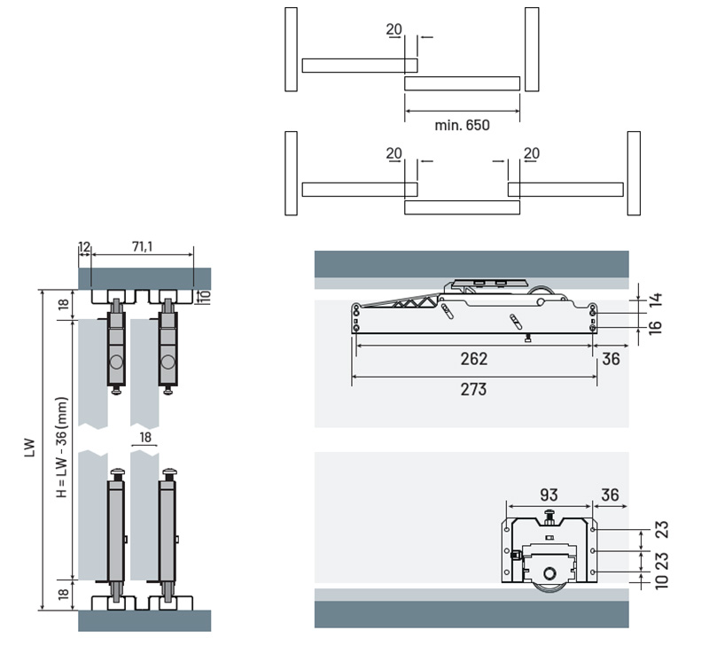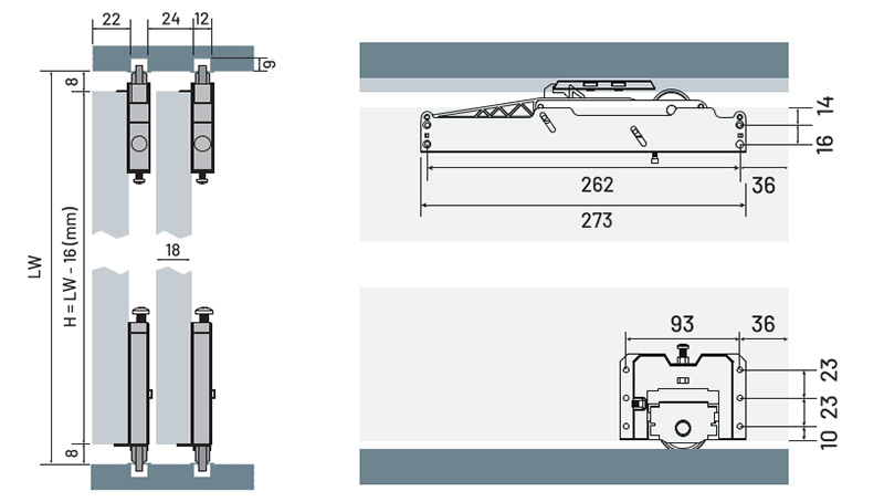 Szerelése egyszerű, a hagyományos tolóajtó rendszerekkel ellentétben bármilyen marás nélkül megúszhatjuk a beépítését. Az alsó és a felső, beépített csillapítóval szerelt görgőket csak fel kell csavarozni az ajtólapra. A felső- és az alsó sín kapható egyszerű, rácsavarozható változatban (dupla sín), vagy bemarható sínek alkalmazásával el is rejthetjük azokat. A felső sínekbe a szerelés előtt behelyezzük, majd a beállításnál pozicionáljuk a csillapítók aktivátorát. A fogantyúprofilok egyszerűen, egy gumikalapáccsal finoman ráütögetve rögzülnek a lap éleken, ezt követően hátulról apró csavarokkal rögzítendőek.